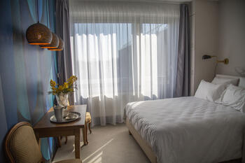Like wild bluish feathers, thanks to its elegant design and subtle colors, the double room will quickly make you feel at home. Intimate and warm, it will meet the practical needs of people traveling alone or for business. Each of them has a shower and all the necessary accessories for everyday life, wifi, USB socket, hairdryer, welcome tray with tea, coffee and kettle.